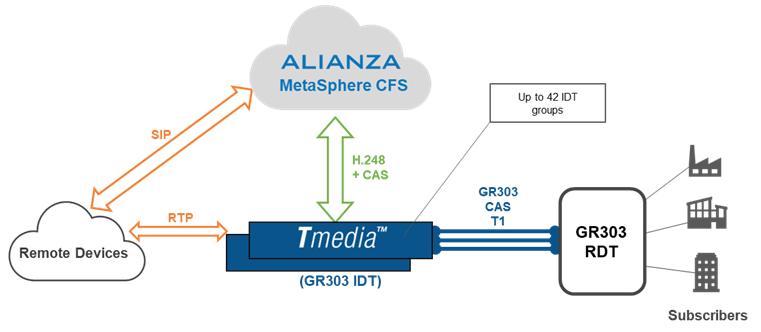 The Tmedia gateway connects directly to GR-303-based remote terminals, allowing providers to preserve their access lines. It converts GR-303 signaling to H.248 and hands it off to the software-based MetaSphere CFS. The softswitch handles SIP registration, subscriber services, and all call control functions.